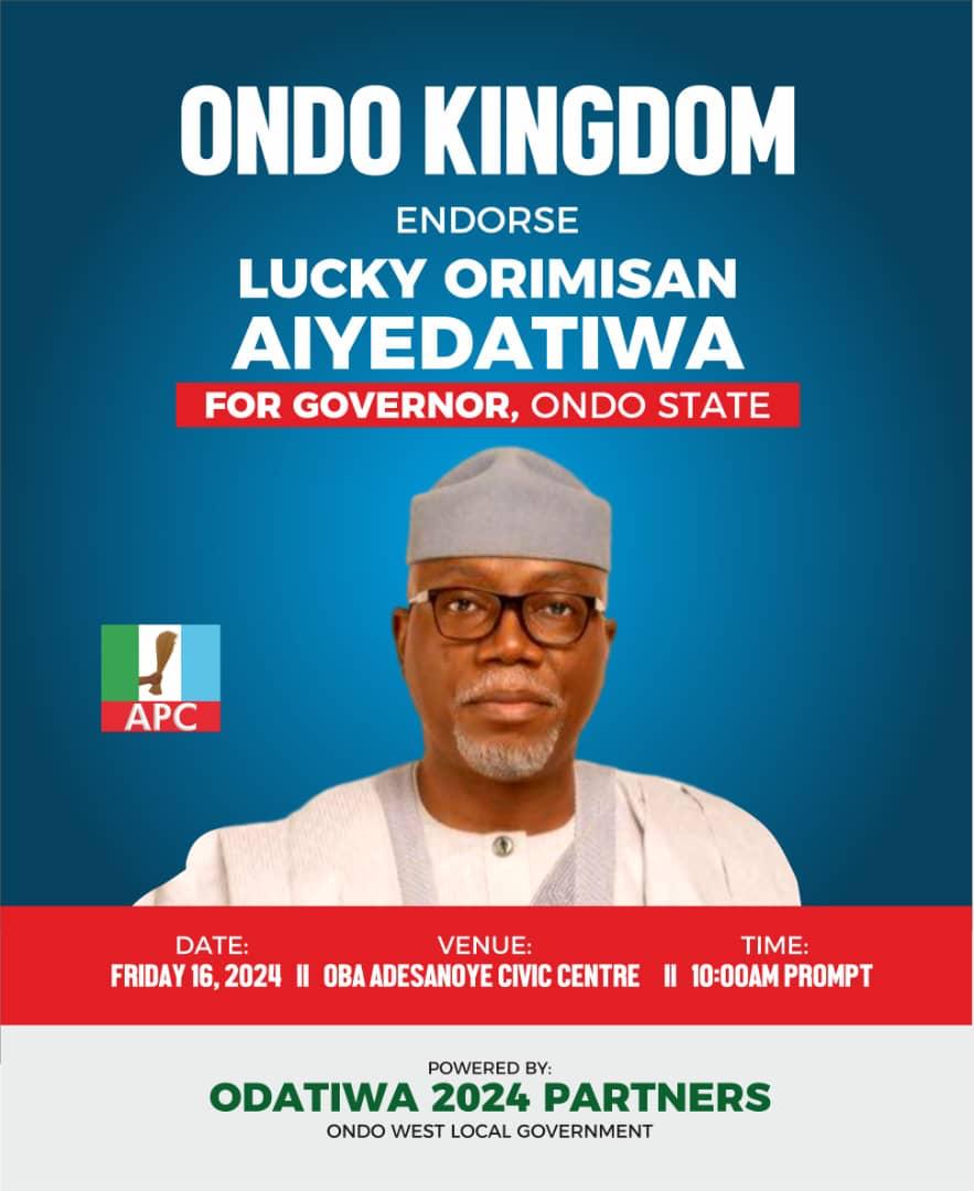 ONDOPOLITICS2024 Guber race: Ondo Kingdom Endorses Aiyedatiwa admin2 years ago01 mins Political leaders in Ondo Kingdom will on Friday 16th February 2024 endorsed the State Governor, Hon. Lucky Aiyedatiwa ahead of this year’s November governorship election in Ondo State. Post navigation Previous: Ondo former Speakers, Ilaje Group back AiyedatiwaNext: Don’t abuse your powers —Aiyedatiwa urges Ondo monarchs Leave a Reply Cancel replyYour email address will not be published. Required fields are marked *Comment * Name * Email * Website Save my name, email, and website in this browser for the next time I comment.