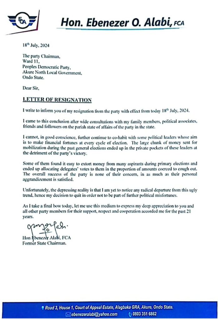 UncategorizedJust In: Former Ondo PDP Chairman dumps party ahead of guber race admin1 year ago01 mins Former Ondo state PDP chairman,Hon Ebenezer Alabi resigns from the party. Post navigation Previous: Economic crisis: New Minimum wage getting too delayed, meet Labour demand —PDP Govs tell TinubuNext: 2024 guber poll: Makinde’s group ‘HAM Volunteers’ mobilises Ondo artisans for Aiyedatiwa Leave a Reply Cancel replyYour email address will not be published. Required fields are marked *Comment * Name * Email * Website Save my name, email, and website in this browser for the next time I comment.