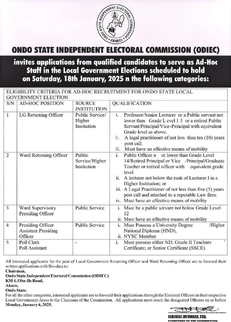 The Ondo State Independent Electoral Commission (ODIEC) has commenced the process of recruiting ad-hoc staff for the forthcoming council Election.