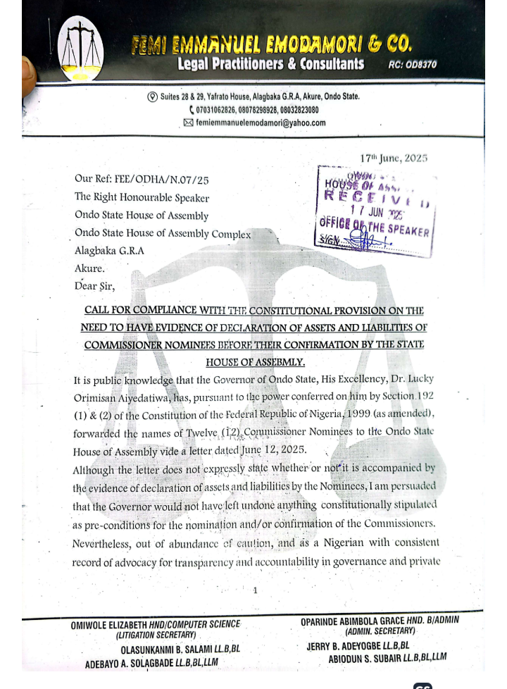 An Akure, Ondo state- based legal practitioner, Mr Femi Emmanuel Emodamori, has called for compliance with the constitutional provision on the need to have evidence of Declaration of Assets and liabilities of Commissioner nominees in Ondo State before their screening and confirmation by the State House Of Assembly.