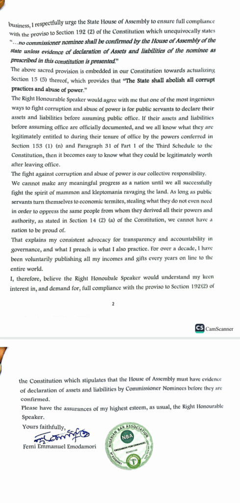 “I, therefore, believe the Right Honourable Speaker would understand my keen interest in, and demand for, full compliance with the proviso to Section 192(2) of the Constitution which stipulates that the House of Assembly must have evidence of declaration of assets and liabilities by Commissioner Nominees before they are confirmed. Please have the assurances of my highest esteem, as usual, the Right Honourable Speaker,” Emodamori said.