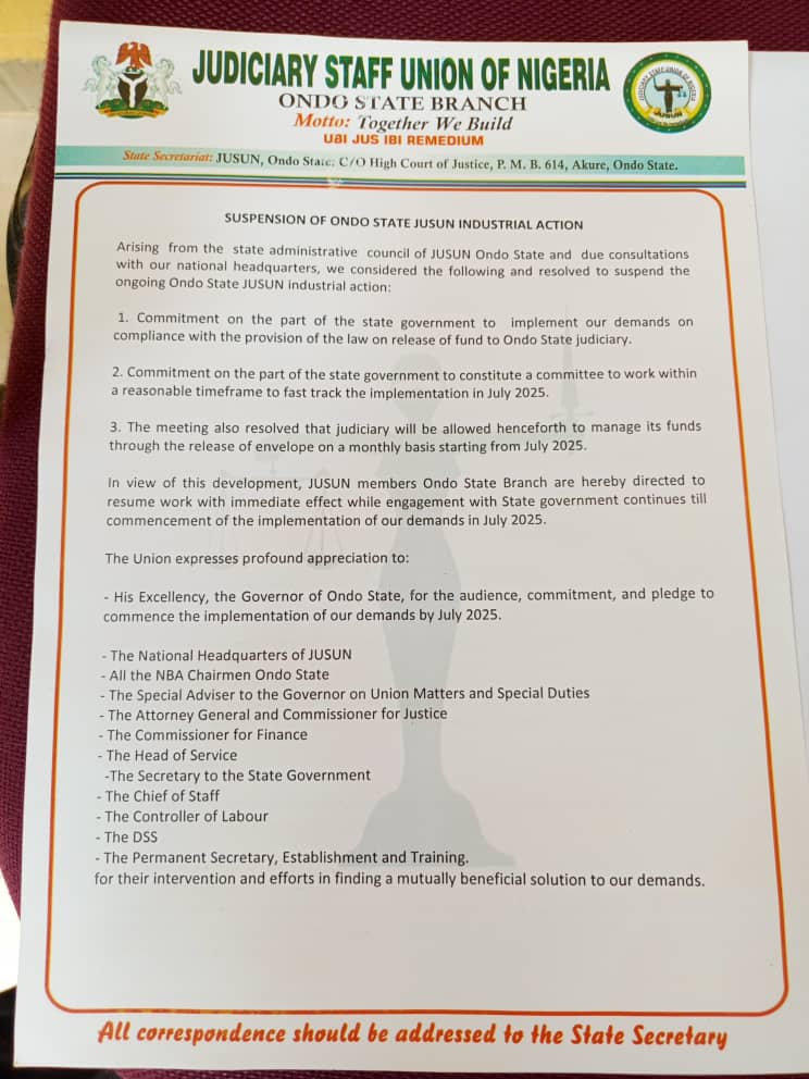 “In view of this development, JUSUN members Ondo State Branch are hereby directed to resume work with immediate effect while engagement with State government continues till commencement of the implementation of our demands in July 2025.”