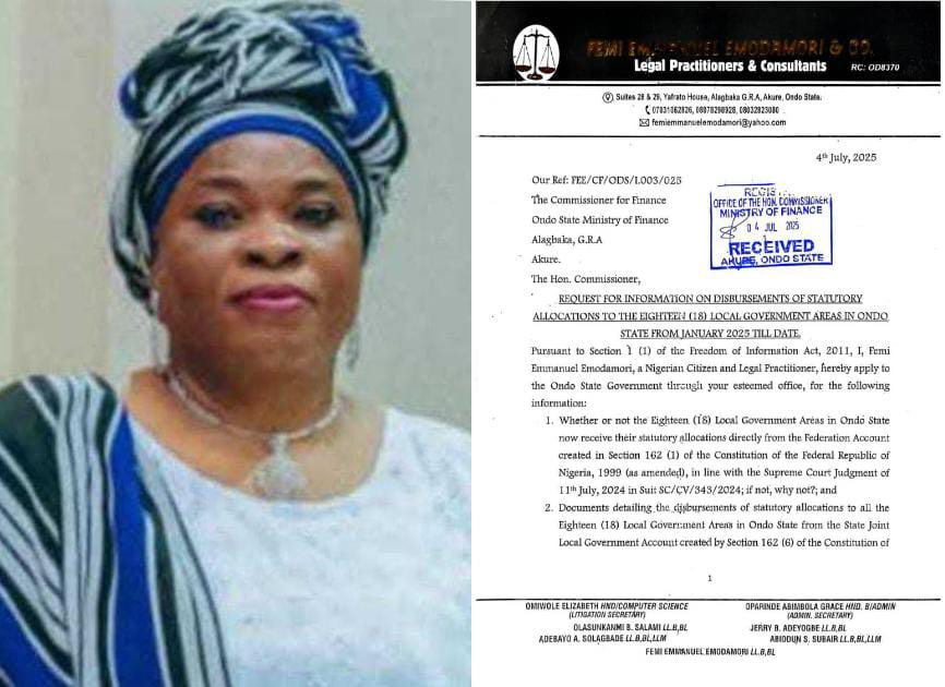 Emodamori said, “REQUEST FOR INFORMATION ON DISBURSEMENTS OF STATUTORY ALLOCATIONS TO THE EIGHTEEN (18) LOCAL GOVERNMENT AREAS IN ONDO STATE FROM JANUARY 2025 TILL DATE. Pursuant to Section 1 (1) of the Freedom of Information Act, 2011, I, Femi Emmanuel Emodamori, a Nigerian Citizen and Legal Practitioner, hereby apply to the Ondo State Government through your esteemed office, for the following information: