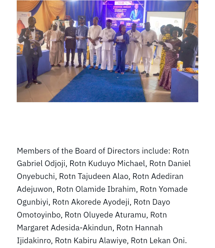 Members of the Board of Directors include: Rotn Gabriel Odjoji, Rotn Kuduyo Michael, Rotn Daniel Onyebuchi, Rotn Tajudeen Alao, Rotn Adediran Adejuwon, Rotn Olamide Ibrahim, Rotn Yomade Ogunbiyi, Rotn Akorede Ayodeji, Rotn Dayo Omotoyinbo, Rotn Oluyede Aturamu, Rotn Margaret Adesida-Akindun, Rotn Hannah Ijidakinro, Rotn Kabiru Alawiye, Rotn Lekan Oni.