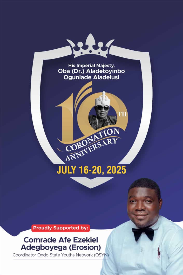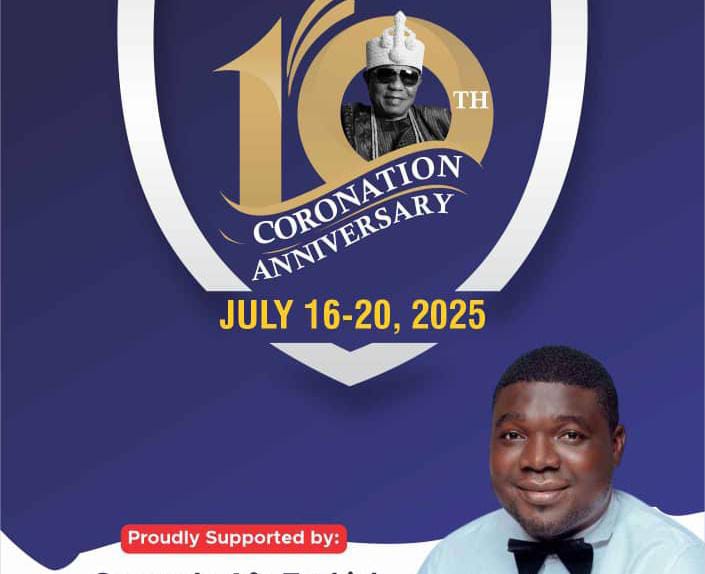 With deep respect and genuine joy, I warmly congratulate His Imperial Majesty, Oba (Dr.) Aladetoyinbo Ogunlade Aladelusi, Odundun II, on the occasion of your 10th Coronation Anniversary as the Deji of Akure Kingdom.