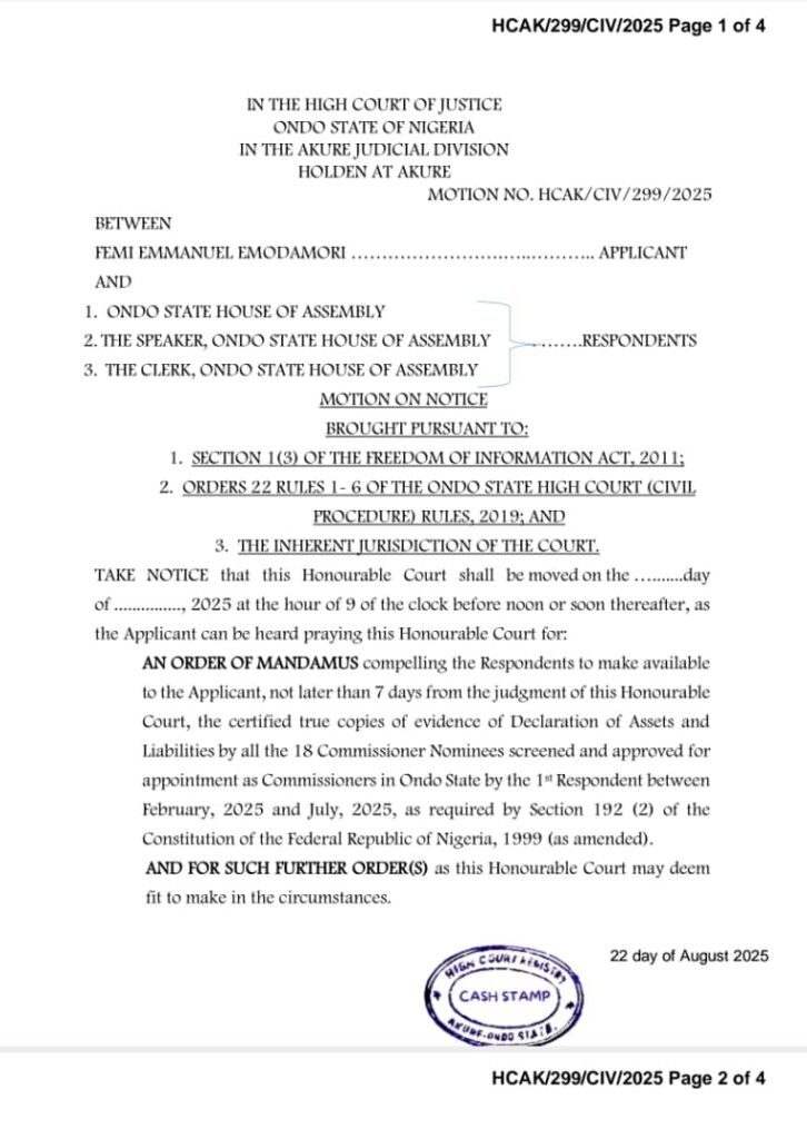 In Suit HCAK/299/CIV/2025 instituted against the Ondo State House of Assembly, the Speaker of the House and the Clerk of the House, Emodamori is also praying for an Order of Mandamus compelling the Respondents to make available to him, not later than 7 days from the judgment of the Court, the certified true copies of evidence of Declaration of Assets and Liabilities by all the 18 Commissioner Nominees screened and approved for appointment by the House (sued as the 1st Respondent) between February, 2025 and July, 2025, as required by Section 192 (2) of the Constitution of the Federal Republic of Nigeria, 1999 (as amended).