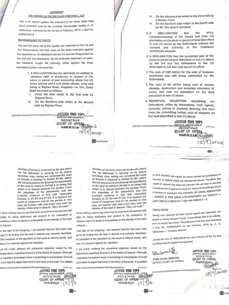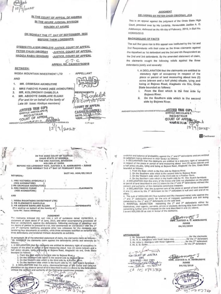 The Judgment was entered by the Honourable Justice A. O. Adebusoye on 4th February, 2019 but WODA MOUNTAINS INVESTMENT LIMITED appealed the verdict at the Court of Appeal, Akure Division, the case which the firm has been lost.