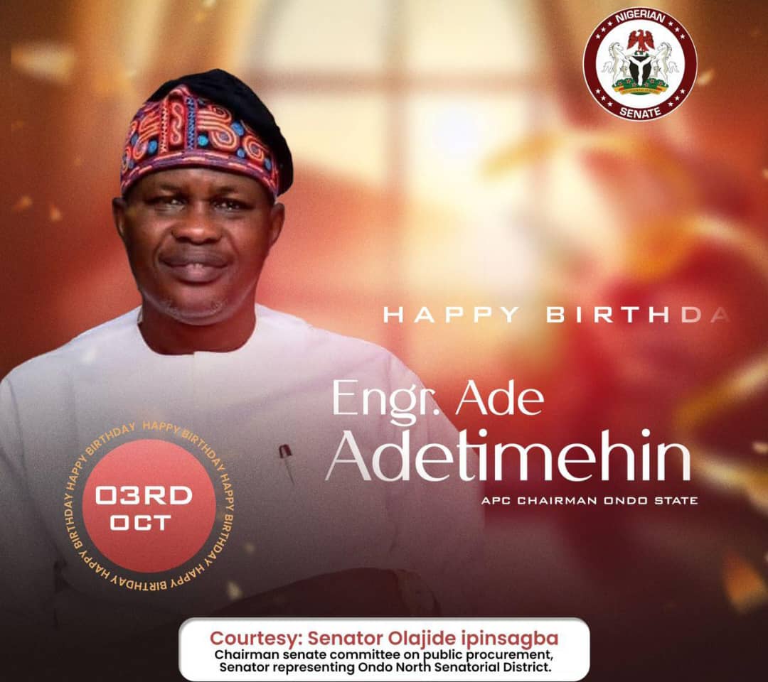 On this auspicious day, I, Senator Olajide Ipinsagba, Chairman, Senate Committee on Public Procurement and Distinguished Senator representing Ondo North Senatorial District, join the progressive family, the people of Ondo State, and the entire nation in saluting your towering leadership.
