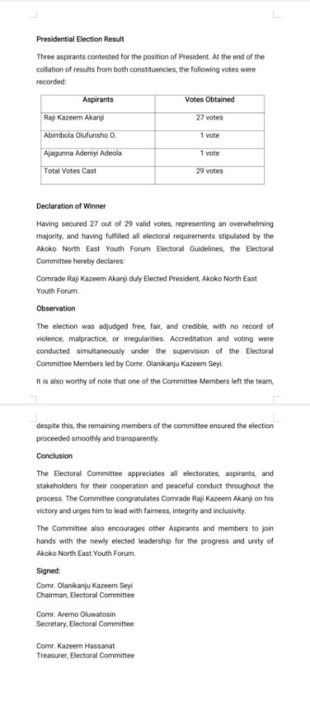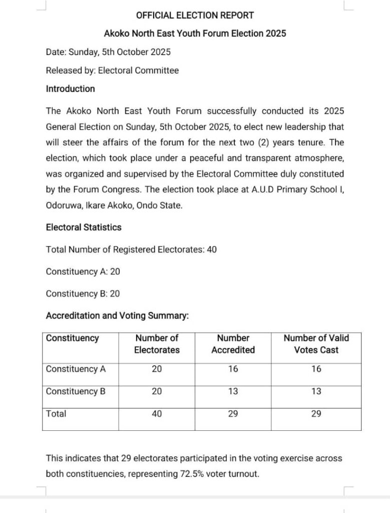 The Akoko North East Youth Forum has successfully conducted its 2025 General Election on Sunday, 5th October 2025, to elect new leadership that will steer the affairs of the forum for the next tenure.
