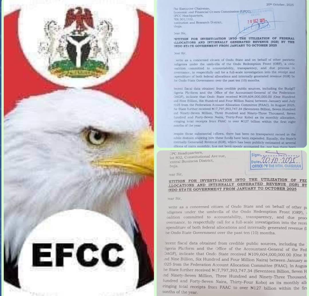 A foremost civic group in Ondo State, the Ondo Redemption Front (ORF), has petitioned the Economic and Financial Crimes Commission (EFCC) and the Independent Corrupt Practices and Other Related Offences Commission (ICPC), calling for a comprehensive investigation into the management of both Local Government allocations and State funds in the state.