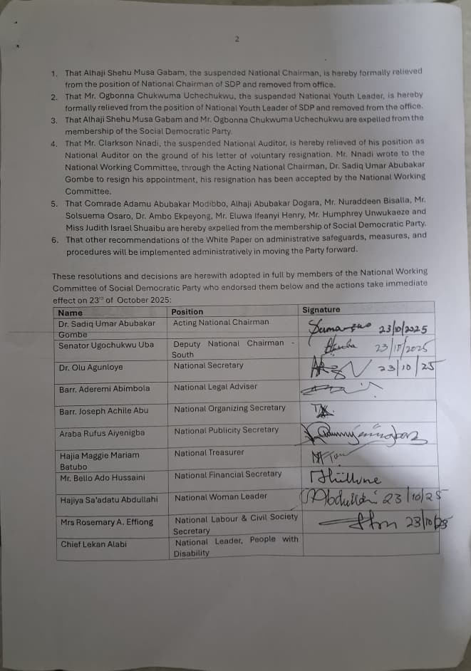 The National Working Committee (NWC) of the Social Democratic Party (SDP) has officially removed its National Chairman, Alhaji Shehu Musa Gabam, from office over allegations of financial misappropriation, abuse of office, and gross misconduct.