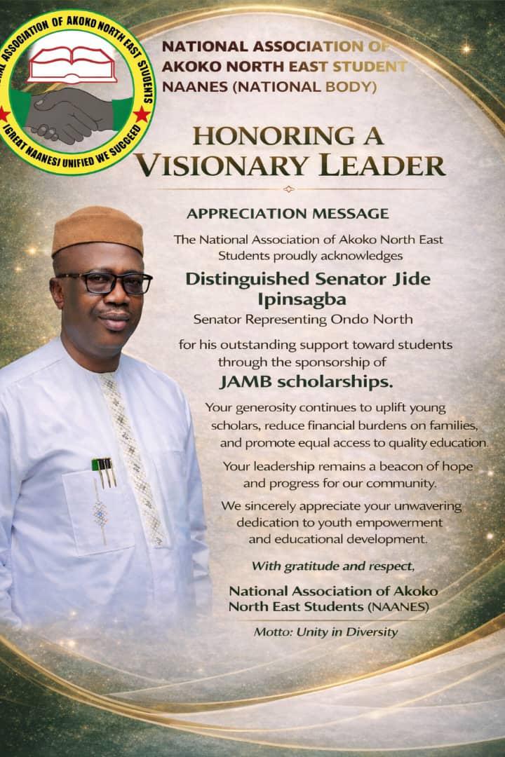 The National Body of the National Association of Akoko North East Students (NAANES) sincerely expresses our heartfelt appreciation to Jide Ipinsagba, the Distinguished Senator representing Ondo North Federal Constituency, for his generous initiative in providing free JAMB slots to students across Ondo North.